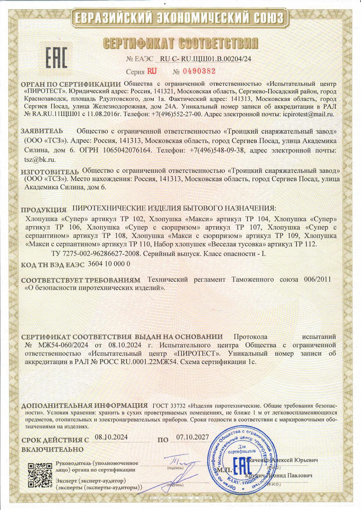 Хлопушки с конфетти имеют Сертификат соответствия качества ЕАС